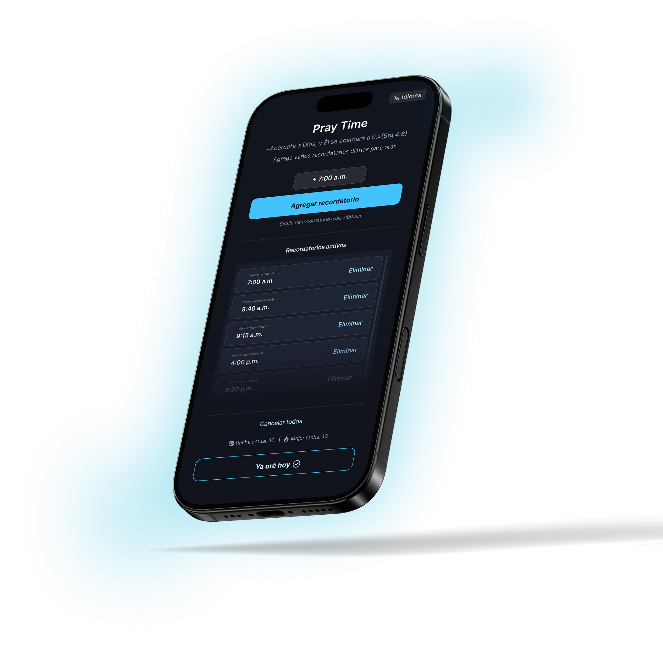 Pray-Time was born from the desire to create a simple tool for those who want to maintain a consistent prayer life amidst busy schedules. It doesn't seek to replace your spirituality, but rather to help you remember your appointments with God.